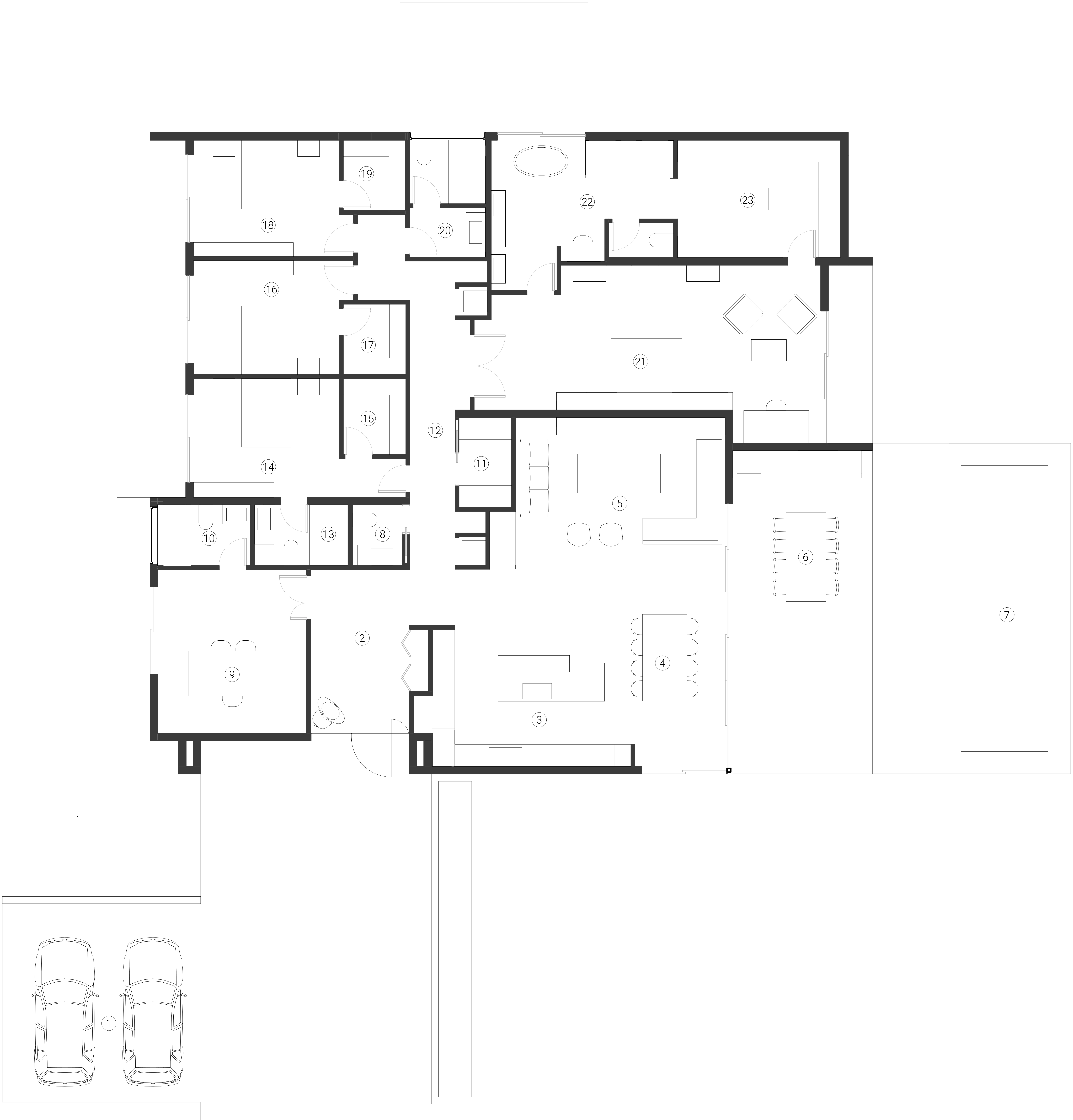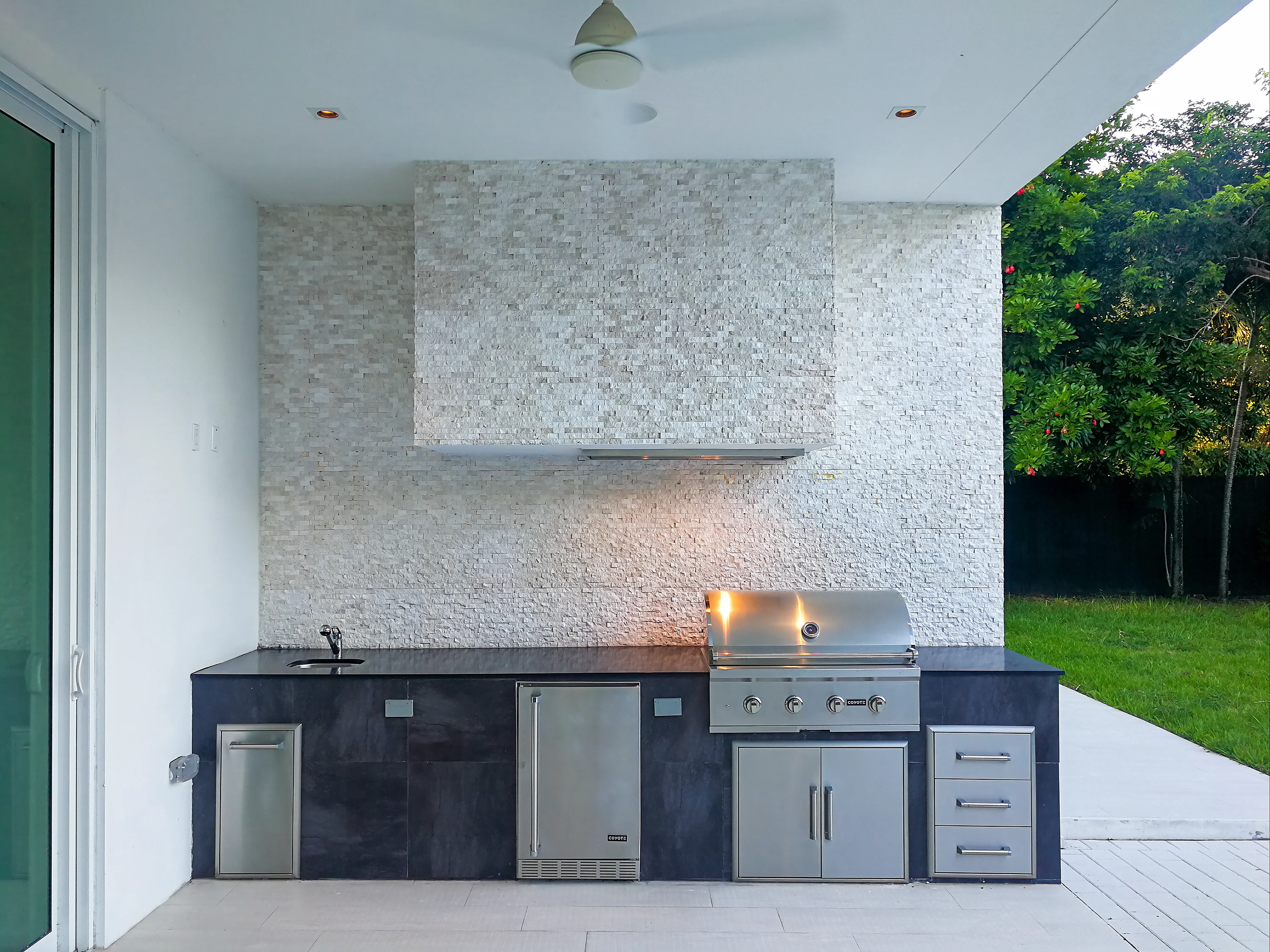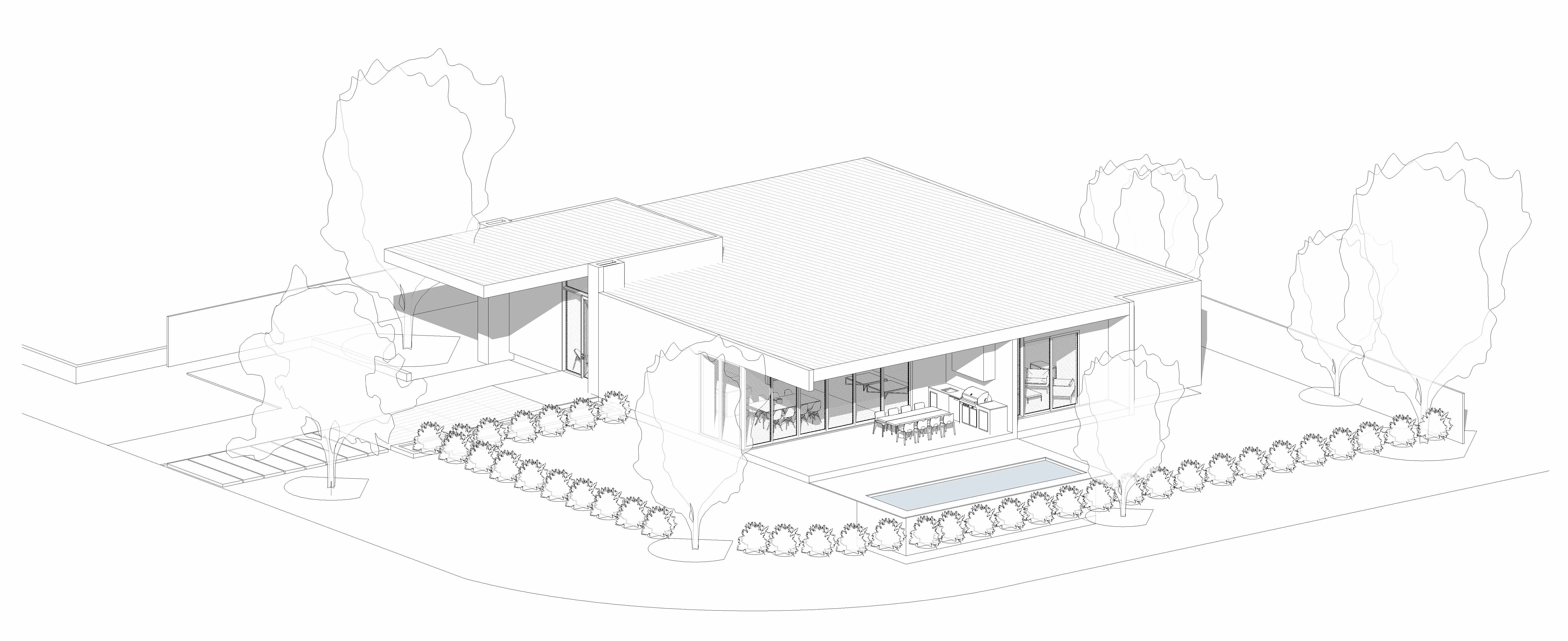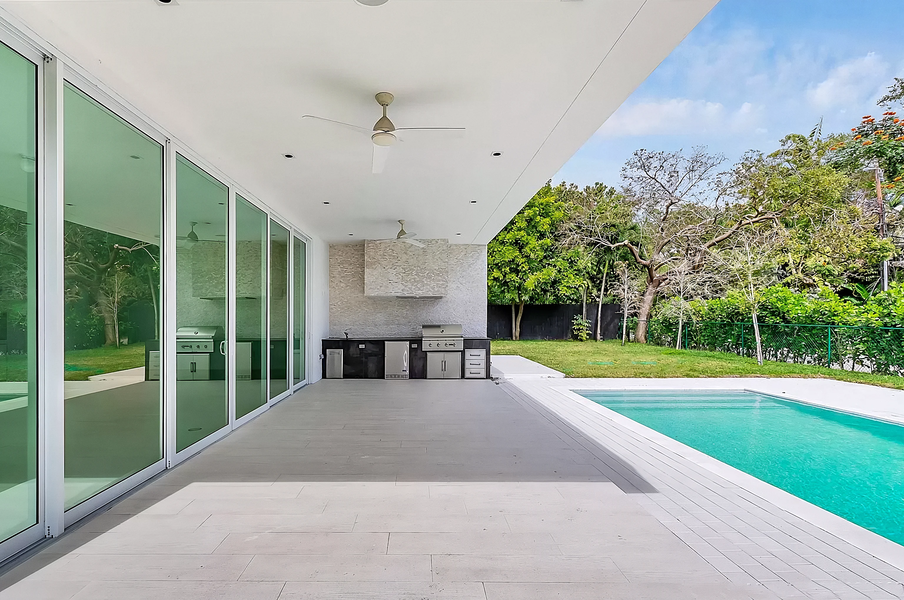 El ingreso se produce a través de un hall de doble altura que actúa como distribuidor hacia tres zonas claras: las áreas sociales, los dormitorios y un estudio. La zona de estar destaca por su amplitud y su apertura total hacia la terraza, que incorpora una barbacoa, una piscina y un jardín frondoso como extensión natural de la vida interior. La casa está pensada para invitar al exterior sin sufrirlo: grandes aleros protegen del sol fuerte de Florida, generando sombra amable y espacios de transición que permiten habitar el clima.