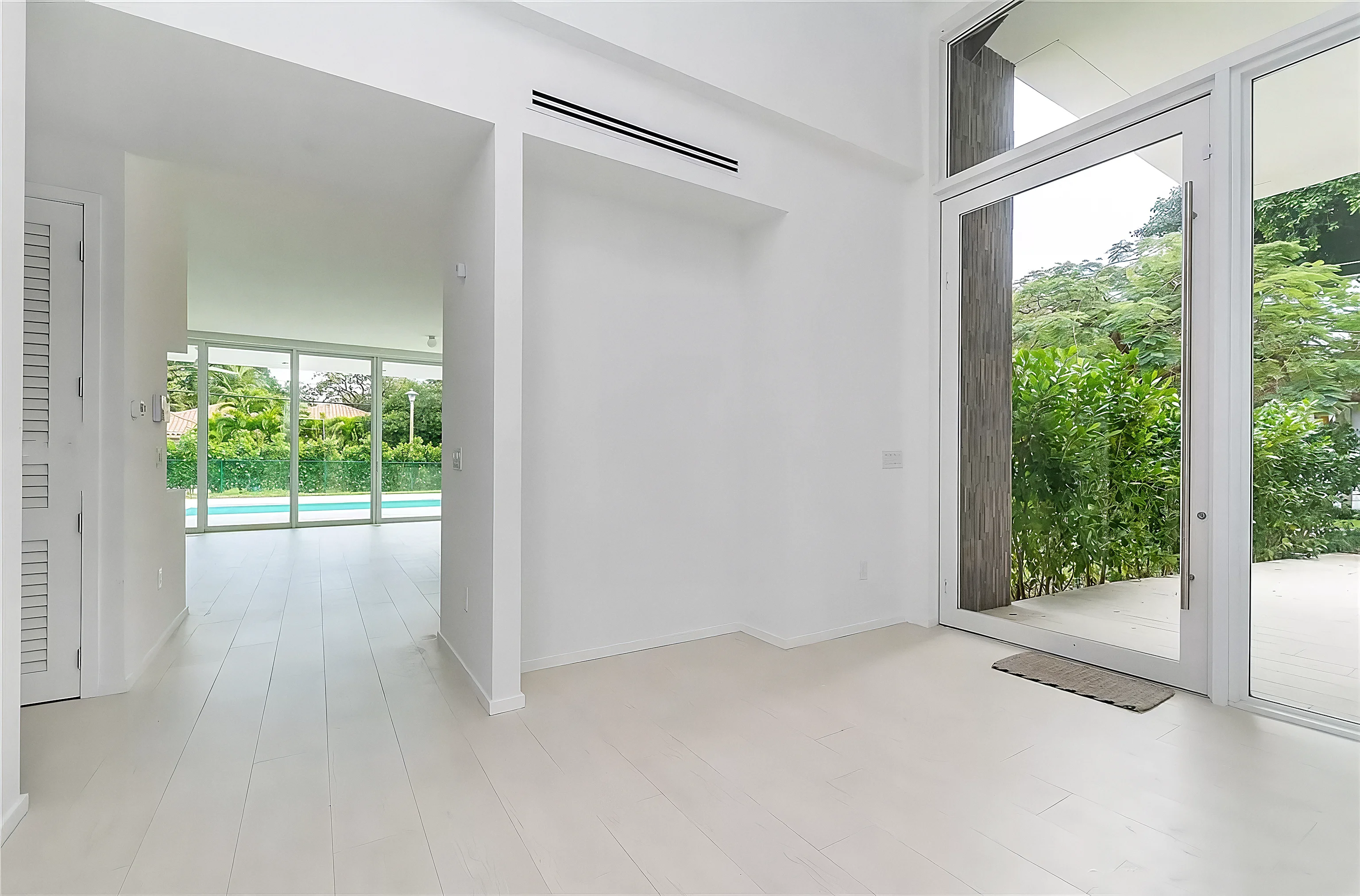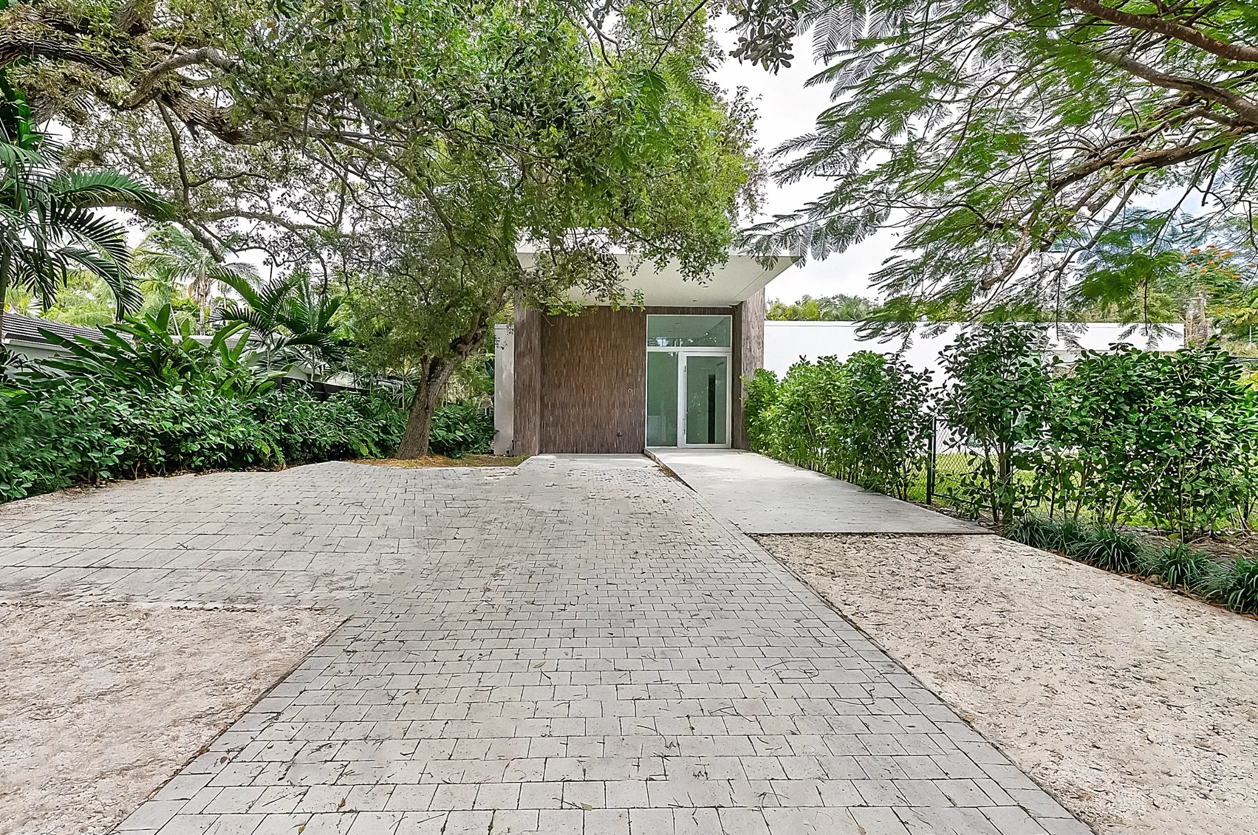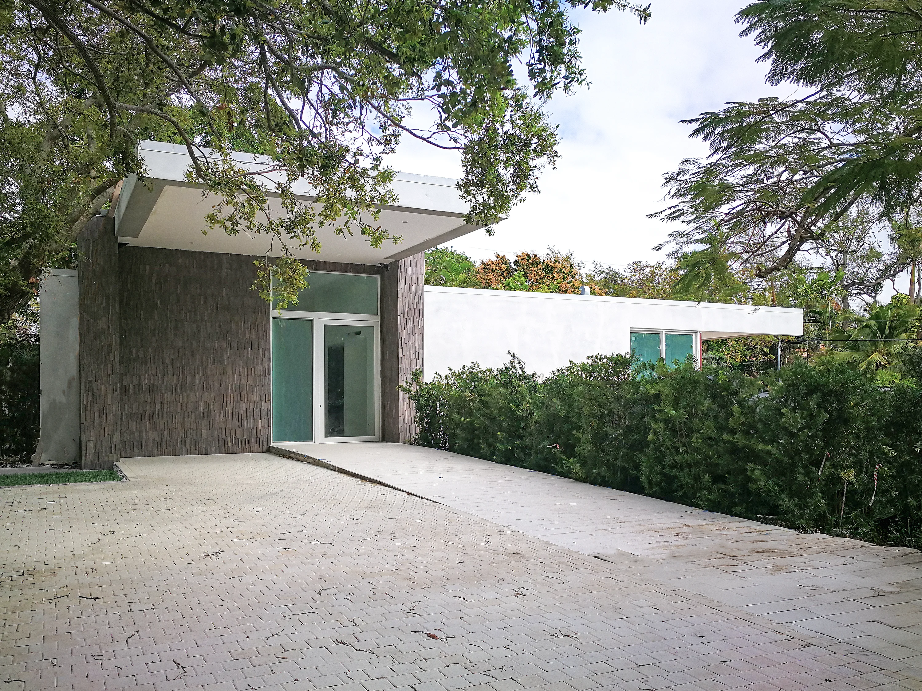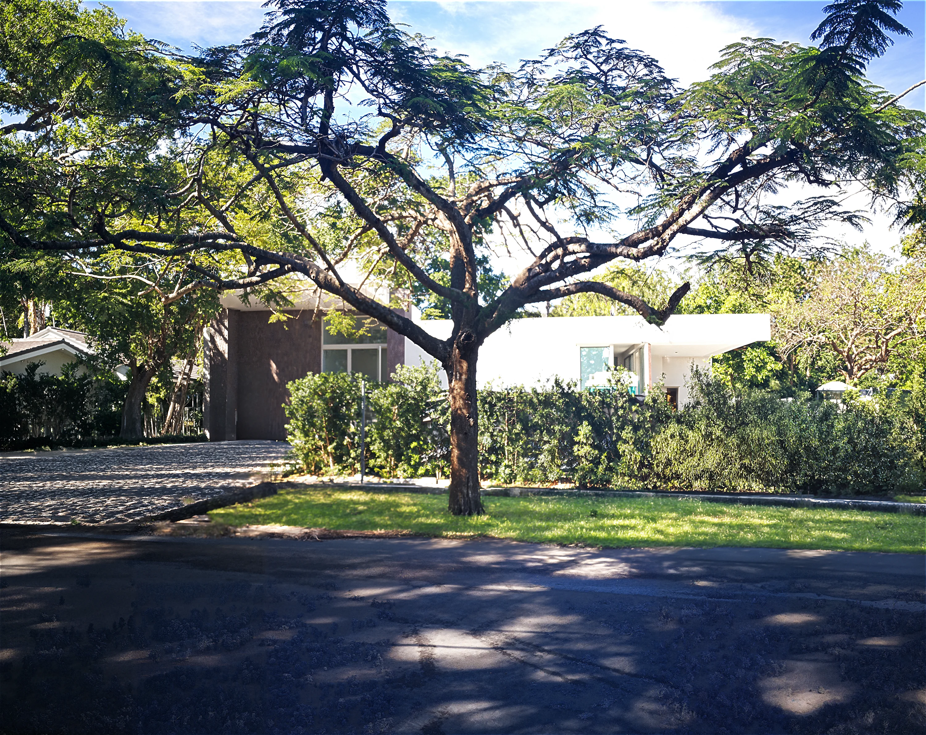 Reforma de una vivienda de una sola planta ubicada en el corazón de Coconut Grove, un barrio donde la vegetación tropical es protagonista. Desde la calle, el proyecto se presenta con sobriedad y luz: un volumen blanco limpio y bajo, apenas interrumpido por un generoso volado que cubre el aparcamiento. A un costado, una majestuosa Poinciana —que da nombre a la calle— enmarca el acceso y anticipa la relación íntima con la naturaleza que define toda la casa.