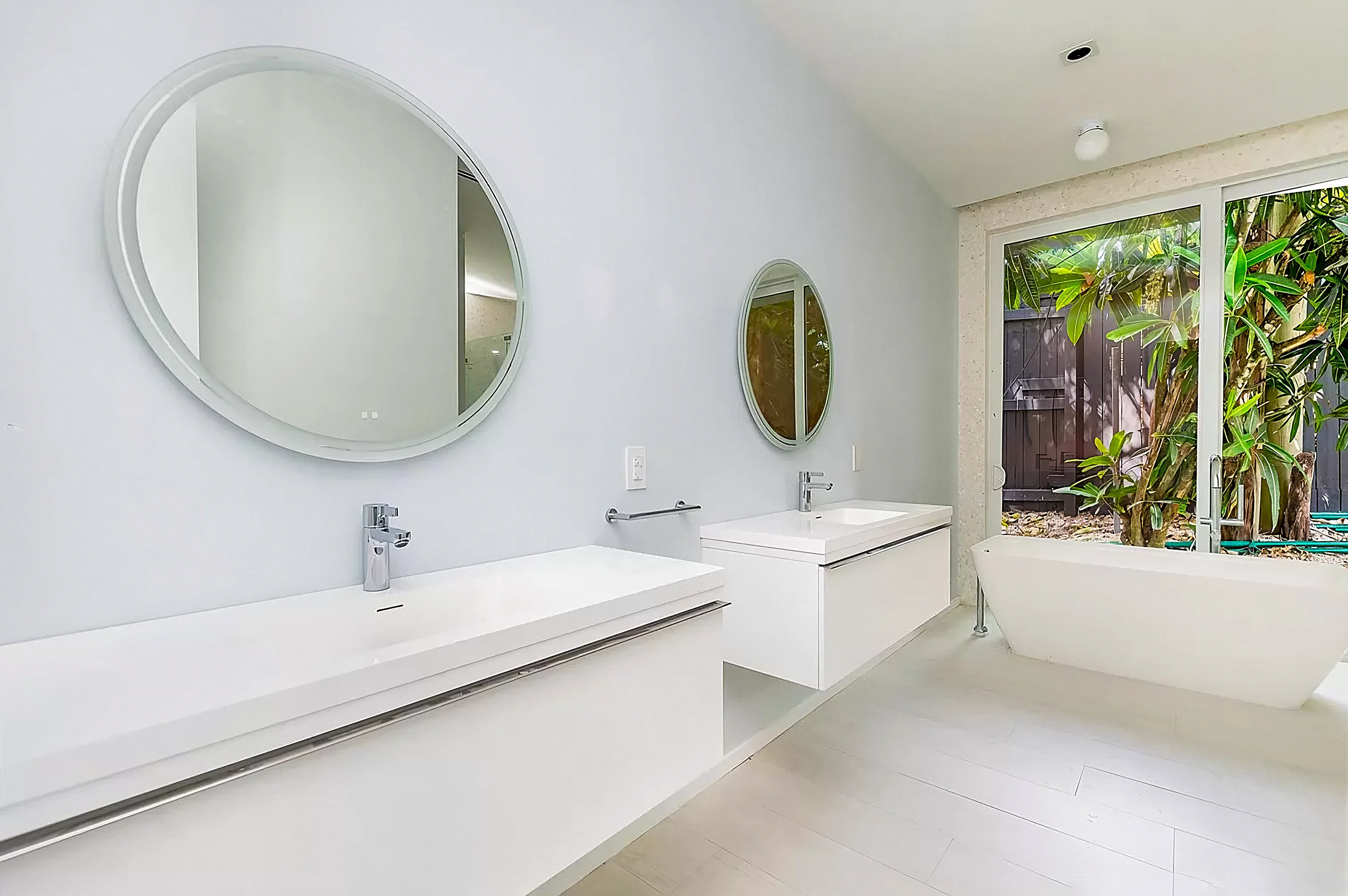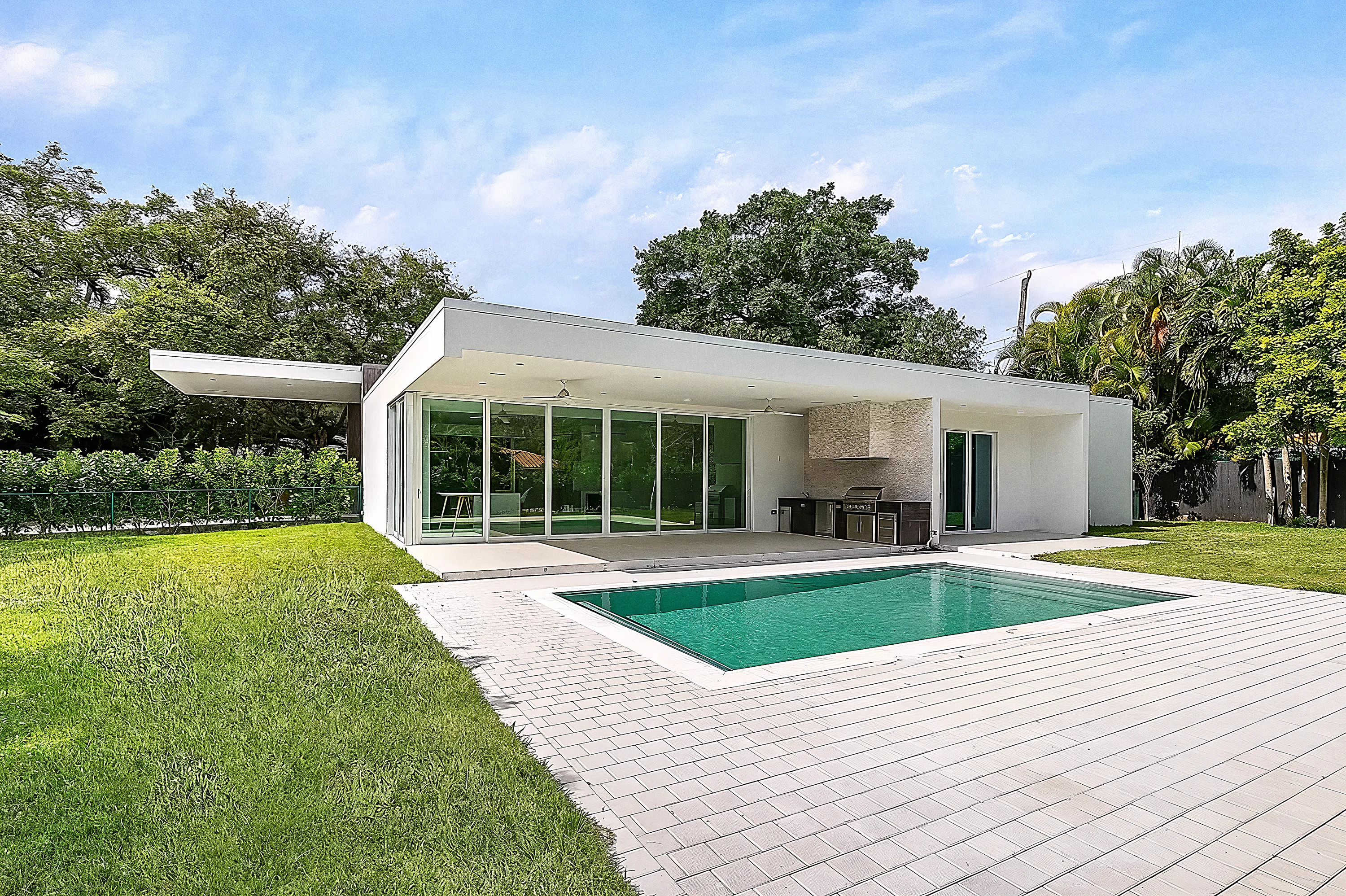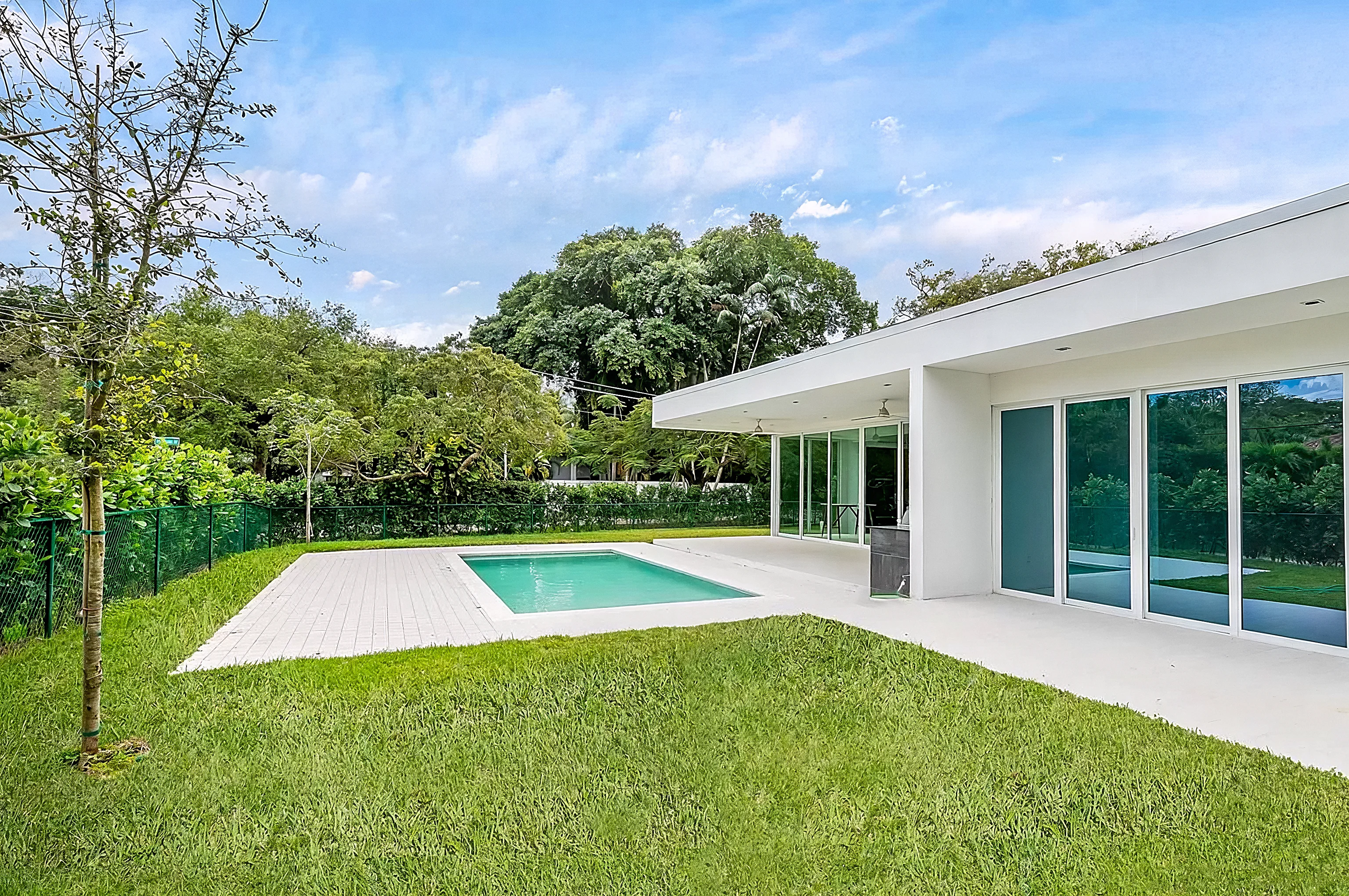 Reforma de una vivienda de una sola planta ubicada en el corazón de Coconut Grove, un barrio donde la vegetación tropical es protagonista. Desde la calle, el proyecto se presenta con sobriedad y luz: un volumen blanco limpio y bajo, apenas interrumpido por un generoso volado que cubre el aparcamiento. A un costado, una majestuosa Poinciana —que da nombre a la calle— enmarca el acceso y anticipa la relación íntima con la naturaleza que define toda la casa.