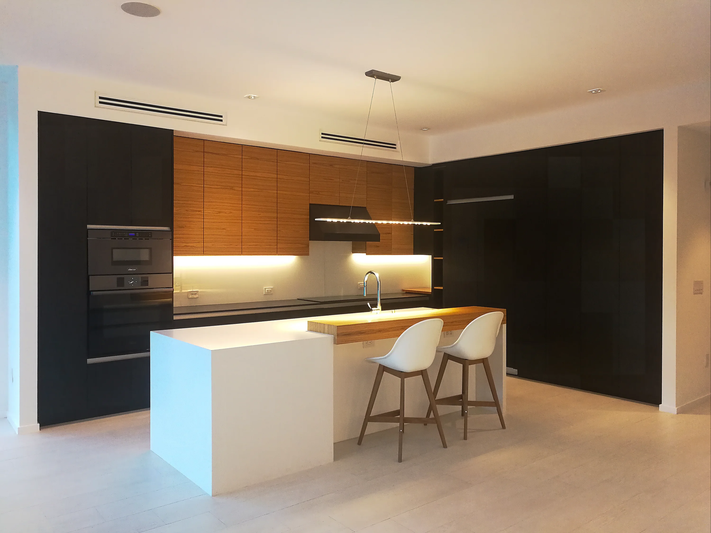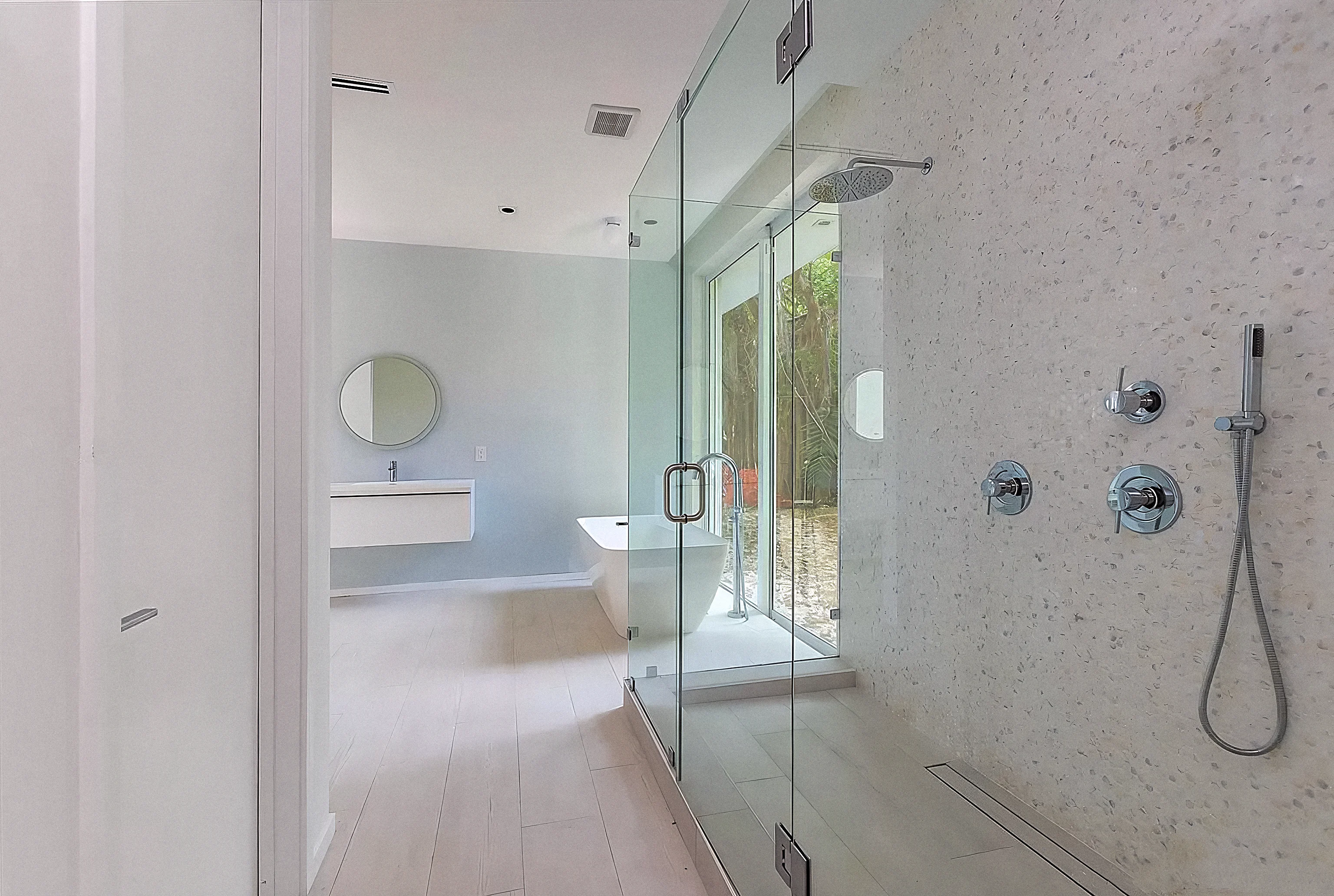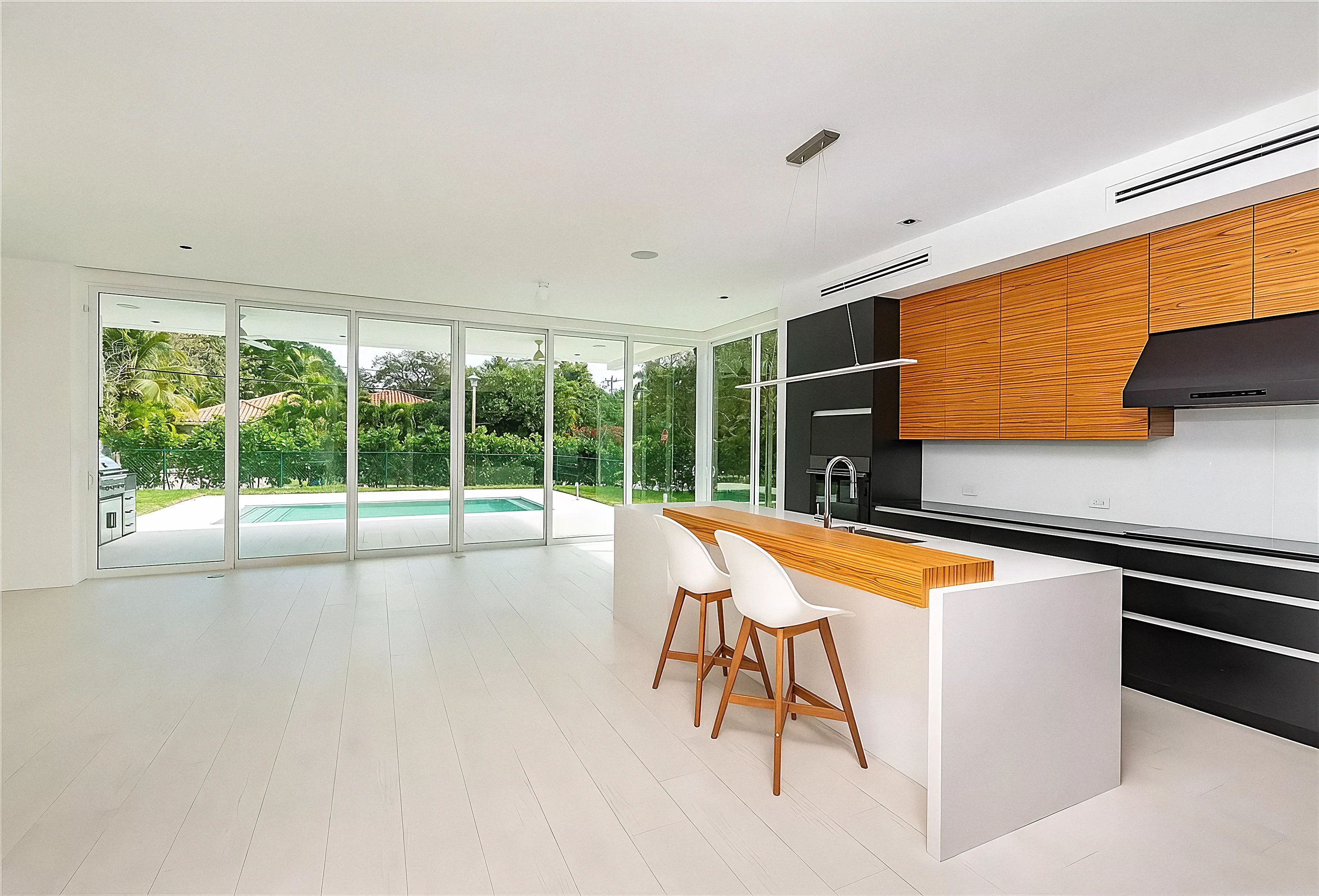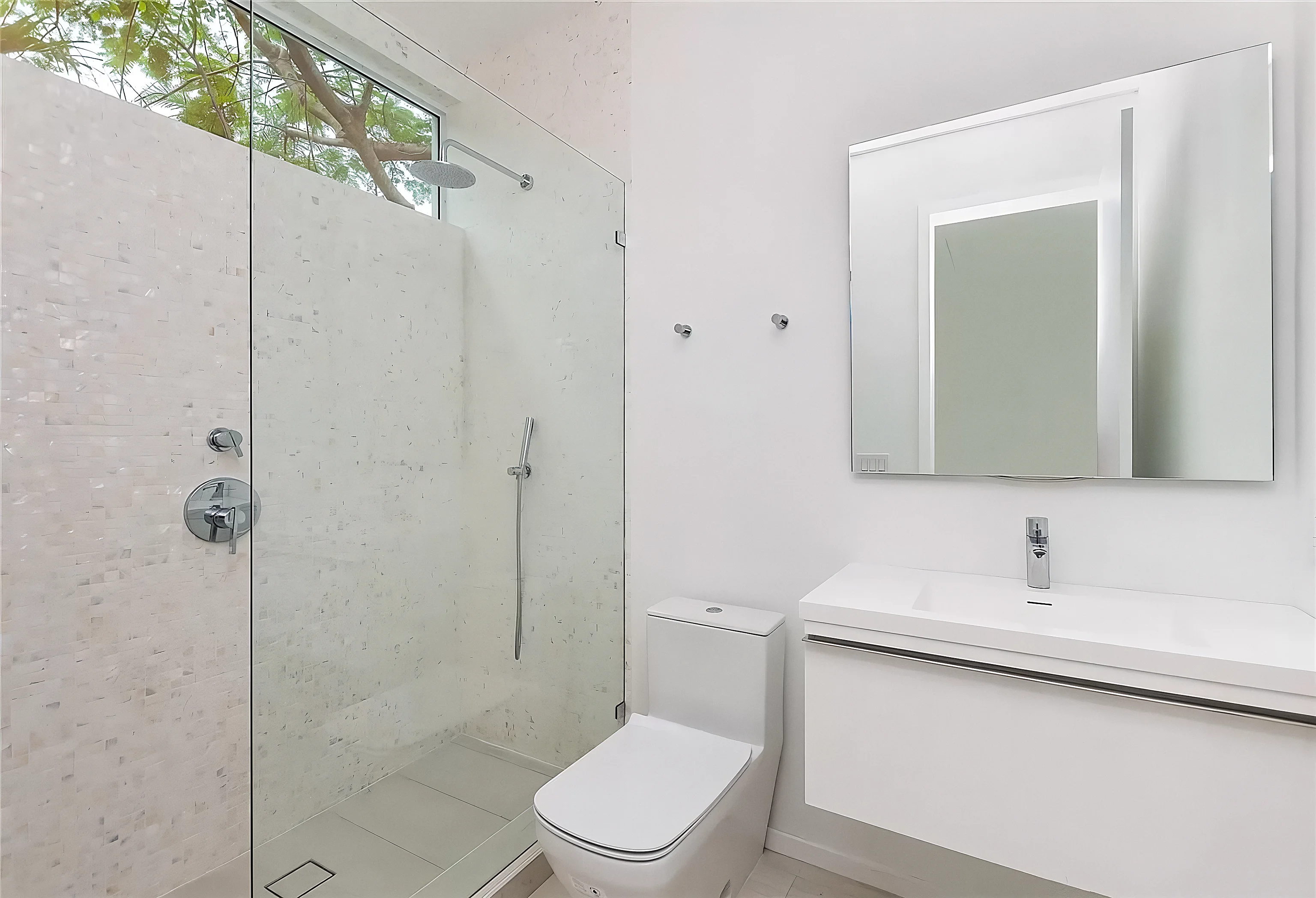 Reforma de una vivienda de una sola planta ubicada en el corazón de Coconut Grove, un barrio donde la vegetación tropical es protagonista. Desde la calle, el proyecto se presenta con sobriedad y luz: un volumen blanco limpio y bajo, apenas interrumpido por un generoso volado que cubre el aparcamiento. A un costado, una majestuosa Poinciana —que da nombre a la calle— enmarca el acceso y anticipa la relación íntima con la naturaleza que define toda la casa.